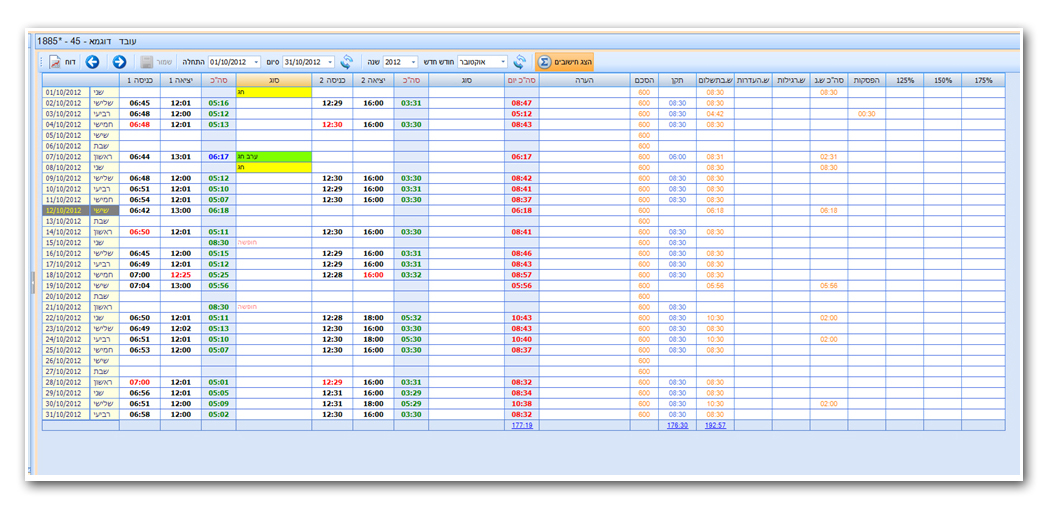 תוכנת נוכחות עובדים - מסך דיווחים המציג חישובים און ליין